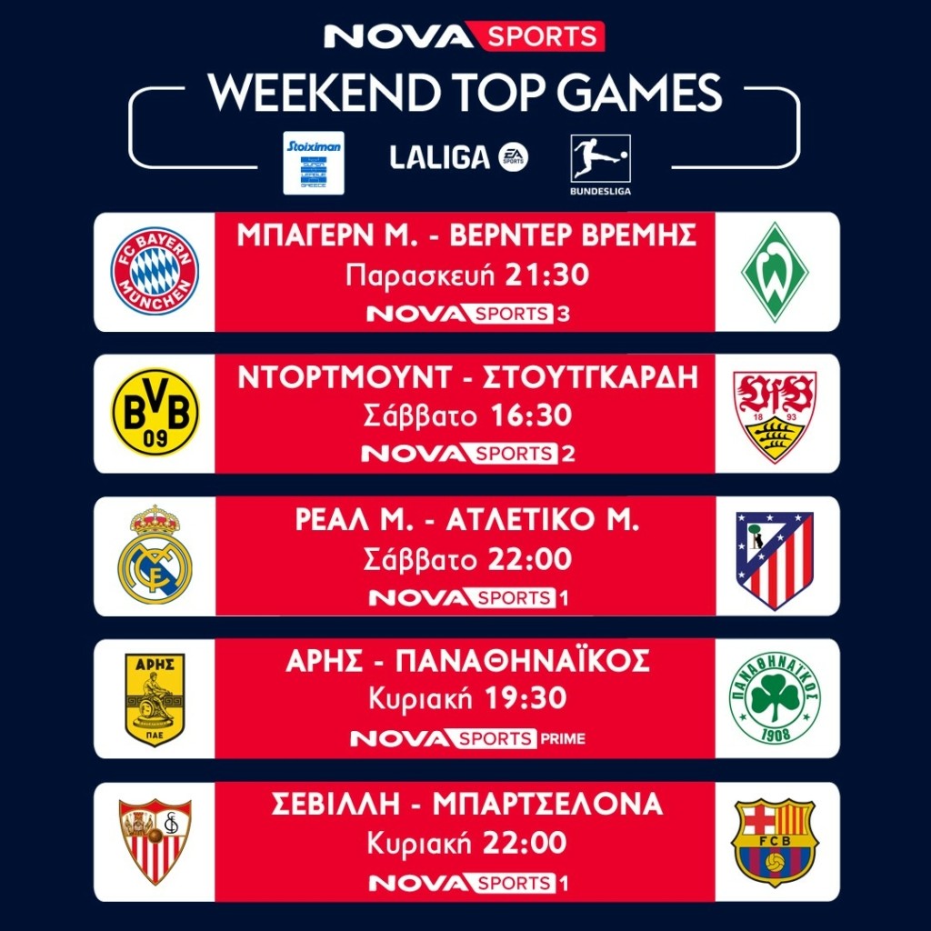 Η συναρπαστική La Liga στην Ισπανία συνεχίζεται στα κανάλια Novasports με το ντέρμπι της Μαδρίτης, Ρεάλ – Ατλέτικο (8/2, 22:00) να κλέβει τις εντυπώσεις ενώ η Μπαρτσελόνα θα αναμετρηθεί εκτός έδρας με τη Σεβίλλη (9/2, 22:00). Την ίδια στιγμή η θεαματική Bundesliga στη Γερμανία καθηλώνει με τους αγώνες Μπάγερν – Βέρντερ (7/2, 21:30) Ντόρτμουντ – Στουτγκάρδη (8/2, 16:30) και Βόλφσμπουργκ – Λεβερκούζεν (8/2, 16:30). Η εκπομπή «Matchday Live» με τον Ηλία Βλάχο μεταφέρει λεπτό προς λεπτό όλη την αθλητική δραστηριότητα από τη Bundesliga αλλά και από τα άλλα πρωταθλήματα που είναι εκείνη την ώρα σε εξέλιξη.