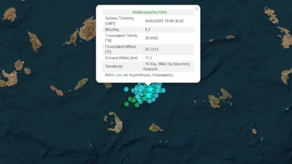Το Γεωδυναμικό Ινστιτούτο υπολογίζει τη δόνηση στα 5,2 Ρίχτερ, σε εστιακό βάθος 11,2 Χλμ. και επίκεντρο στα 16 Χλμ. νότια-νοτιοανατολικά της Αρκεσίνης Αμοργού.
