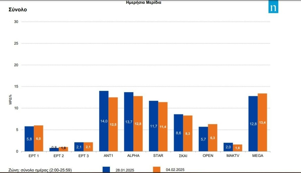 Μικρομεταβολές εμφάνισαν από τη μια μέρα στην άλλη Alpha και ANT1 οι οποίες δεν επηρέασαν την κατάταξη τους, ούτε κι εκείνη στο μερίδιο του ΣΚΑΪ που ήταν κάπως μεγαλύτερη (-0,6%) συγκριτικά με την προχθεσινή επίδοση του.