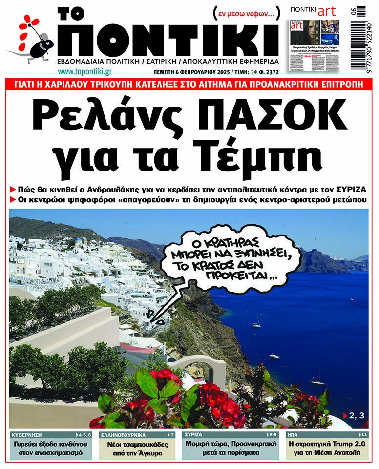 Με πρωτοσέλιδο τίτλο «Ρελάνς ΠΑΣΟΚ για τα Τέμπη» και αναλυτικό – αποκαλυπτικό ρεπορτάζ για το πώς θα κινηθεί ο Ανδρουλάκης για να κερδίσει την αντιπολιτευτική κόντρα με τον ΣΥΡΙΖΑ, αλλά και για τους κεντρώους ψηφοφόρους που «απαγορεύουν» τη δημιουργία ενός κεντρο-αριστερού μετώπου, κυκλοφορεί το «ΠΟΝΤΙΚΙ» το πρωί της Πέμπτης.