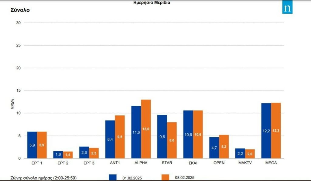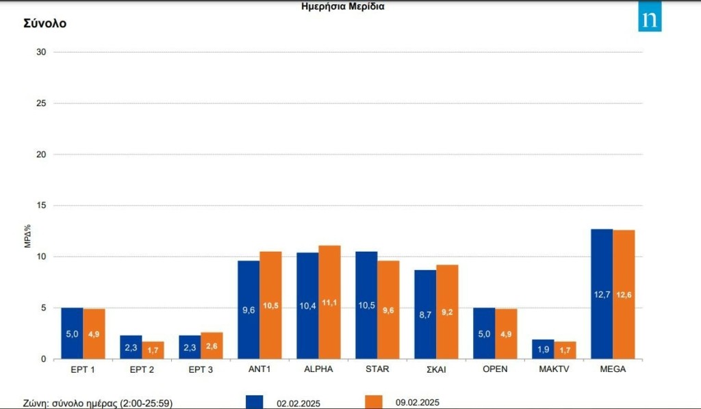 Το Mega «πάτησε» στην κορυφή της τηλεθέασης την Κυριακή, με ελαφρά μεταβολή του μεριδίου του σε σχέση με την προηγούμενη ημέρα, εκμεταλλευόμενο την καθίζηση του Alpha.