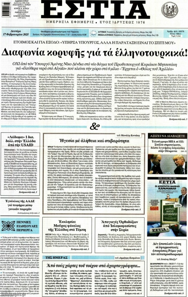 Σημειωνεται ότι η Εστία στο σημερινό της πρωτοσέλιδο αναφέρει: Ετοιμος και για έξοδο ο Νίκος Δένδιας – Διαφωνία κορυφής για τα ελληνοτουρκικά.