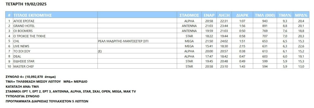 Χθες επέστρεψε η σειρά του Alpha στην πρώτη θέση των τηλεπροτιμήσεων. Στο τρίτο σκαλοπάτι της κλίμακας Nielsen βρέθηκαν οι «Boomers» στην θέση στην οποία τις προηγούμενες δύο ημέρες ήταν η σατιρική «Ράδιο αρβύλα».