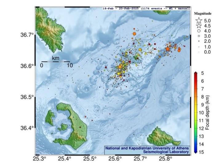 Από την έναρξη της σεισμικής δραστηριότητας στη ζώνη Σαντορίνης-Αμοργού στις 26 Ιανουαρίου έως και τις 19 Φεβρουαρίου 2025, το Εργαστήριο Σεισμολογίας (ΕΣ) του ΕΚΠΑ έχει ανιχνεύσει και εντοπίσει συνολικά, με αυστηρά κριτήρια για τη διασφάλιση της ποιότητας των αποτελεσμάτων, πάνω από 22,600 σεισμούς με μεθόδους μηχανικής μάθησης (τεχνητής νοημοσύνης), εκ των οποίων άνω των 19,300 με μεγέθη Μ³1.0.
