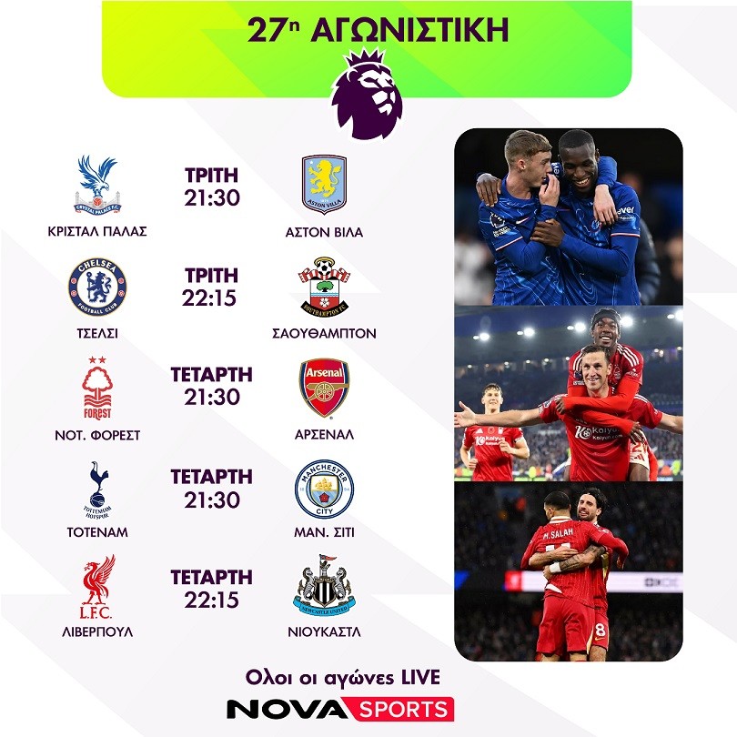 Η Premier League, το κορυφαίο πρωτάθλημα στον κόσμο και με τη φωνή του Χρήστου Σωτηρακόπουλου, συνεχίζεται με εμβόλιμη αγωνιστική και τους αγώνες Νότιγχαμ – Άρσεναλ (26/2, 21:30), Λίβερπουλ – Νιουκάστλ (26/2, 22:15), Τότεναμ – Μάντσεστερ Σίτι (26/2, 21:30) που θα καλυφθούν από τα κανάλια Novasports. Η αγωνιστική θα πλαισιωθεί με την εκπομπή «Matchday Live» με τον Ηλία Βλάχο και «Premier League The Show με τον Γιώργο Σαμαρά και τον Άγγελο Στυλιάδη.