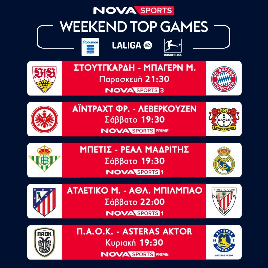 Η συναρπαστική La Liga στην Ισπανία συνεχίζεται στα κανάλια Novasports με τους αγώνες Μπέτις – Ρεάλ Μαδρίτης (1/3, 19:30), Μπαρτσελόνα – Ρεάλ Σοσιεδάδ (2/3, 17:15), Ατλέτικο Μαδρίτης – Μπιλμπάο (1/3, 22:00). Η θεαματική Bundesliga συνεχίζεται με αμείωτο ενδιαφέρον και τους αγώνες Στουτγκάρδη – Μπάγερν (28/2, 21:30), Ζανκτ Πάουλι – Ντόρτμουντ (1/3, 16:30), Άιντραχτ Φρανκφούρτης – Λεβερκούζεν (1/3, 19:30). Η εκπομπή «Matchday Live» με τον Ηλία Βλάχο μεταφέρει λεπτό προς λεπτό όλη την αθλητική δραστηριότητα από τη Bundesliga αλλά και από τα άλλα πρωταθλήματα που είναι εκείνη την ώρα σε εξέλιξη.
