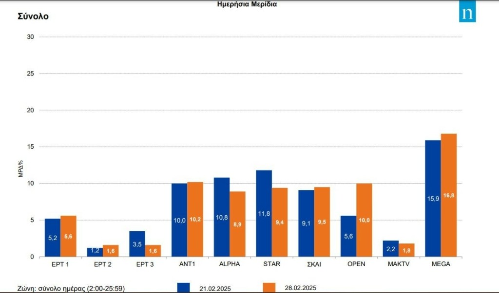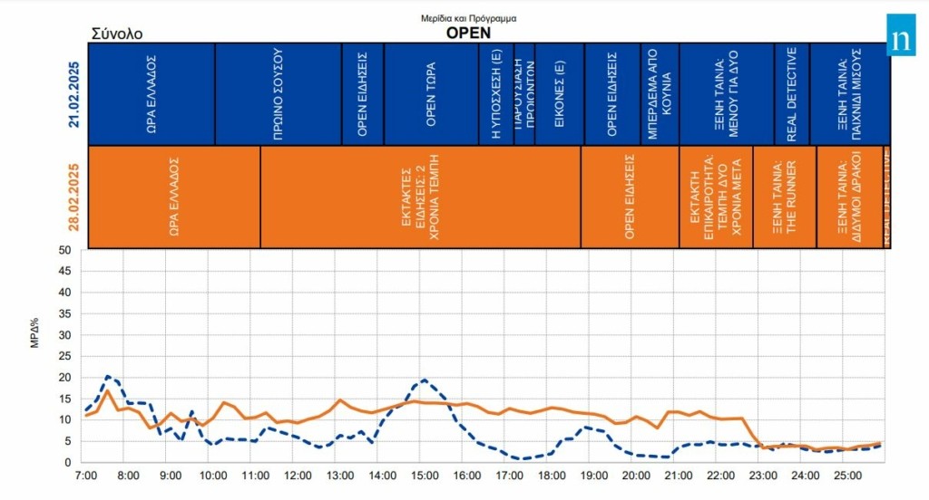 Στα αξιοσημείωτα της 28ης Φεβρουαρίου η επίδοση του Open χάρη στην οποία αναδείχθηκε τρίτη επιλογή των τηλεθεατών. Το κανάλι σχεδόν διπλασίασε το μερίδιο του.