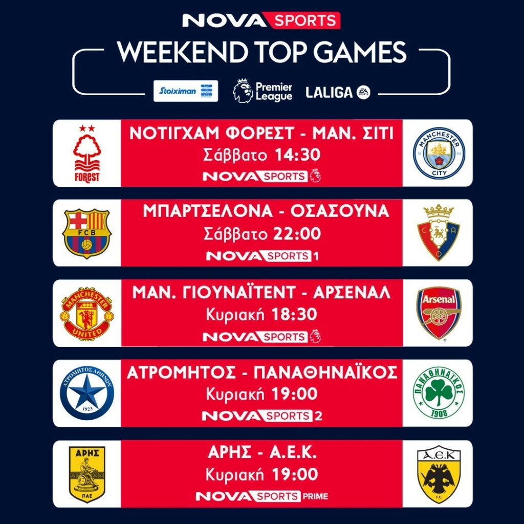 Η Premier League, το κορυφαίο πρωτάθλημα στον κόσμο και με τη φωνή του Χρήστου Σωτηρακόπουλου, συνεχίζεται με αμείωτο ενδιαφέρον και το ντέρμπι Μάντσεστερ Γιουνάιτεντ – Άρσεναλ (9/3, 18:30) καθώς και τους αγώνες Νότιγχαμ Φόρεστ – Μάντσεστερ Σίτι (8/3, 14:30), Λίβερπουλ – Σαουθάμπτον (8/3, 17:00) που θα καλυφθούν από τα κανάλια Novasports. Η αγωνιστική θα πλαισιωθεί με την εκπομπή «Matchday Live» με τον Ηλία Βλάχο και «Premier League The Show με τον Γιώργο Σαμαρά και τον Άγγελο Στυλιάδη.