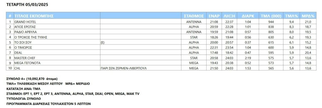 Ο «Αγιος έρωτας» αναγκάστηκε να κατέβει μια θέση στο Top 10 με την εκπομπή «Ράδιο αρβύλα» να διατηρείται στο τρίτο σκαλοπάτι της κλίμακας Nielsen.