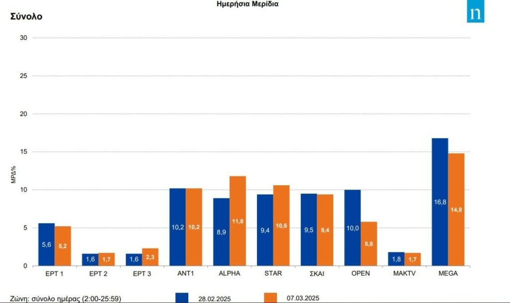«Πάνω» από την ΕΡΤ1, βρέθηκε το Open, καθώς το κρατικό κανάλι εμφάνισε απώλειες κοντά στη μία ποσοστιαία μονάδα, ενώ η ΕΡΤ2 ισοβάθμισε με το ΜΑΚ TV.