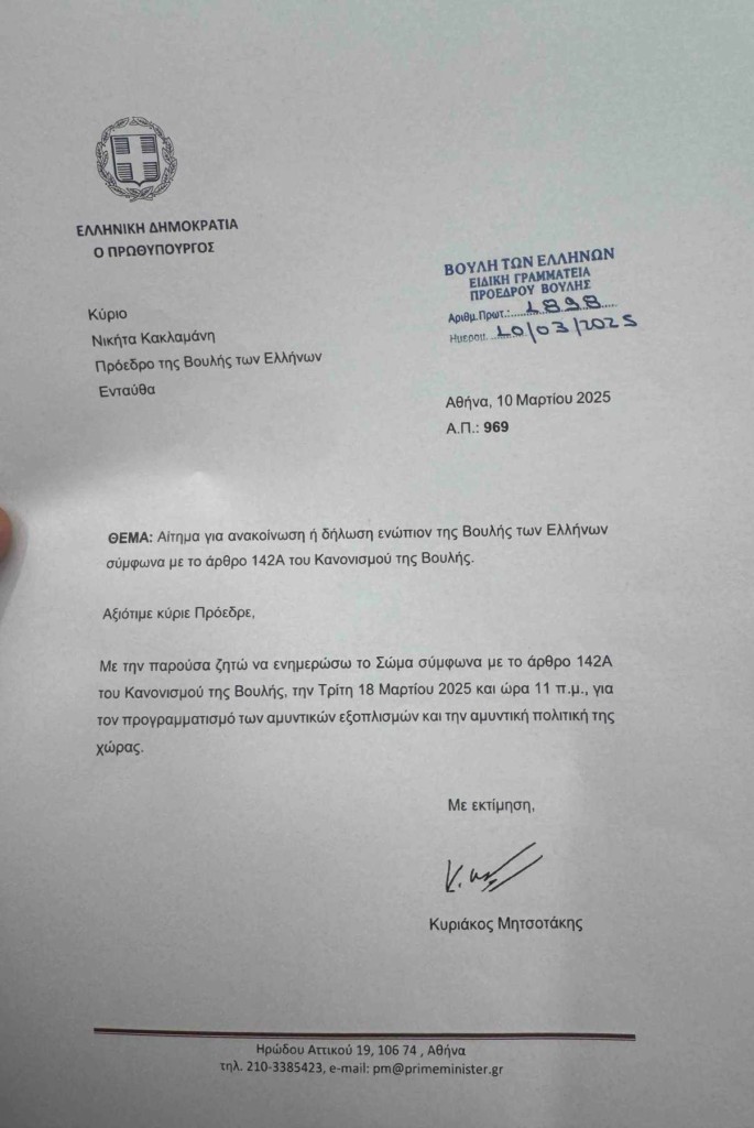 «Εντός των επόμενων εβδομάδων θα προκαλέσω συζήτηση σε επίπεδο αρχηγών κομμάτων, προκειμένου η κυβέρνηση, δια εμού και του Υπουργού Εθνικής Άμυνας, να παρουσιάσει το νέο εξοπλιστικό πρόγραμμα της χώρας για την επόμενη δωδεκαετία. Και να περιγράψει όχι μόνο τους εξοπλισμούς, τους οποίους προκρίνουμε κατόπιν εισηγήσεων από τα Γενικά Επιτελεία, αλλά και τη συνολική φιλοσοφία της αμυντικής μας πολιτικής, καθώς και την ανάγκη να μπορέσουμε, επιτέλους, να κάνουμε κάτι το οποίο η αλήθεια είναι επί δεκαετίες δεν μπορέσαμε να το πετύχουμε, και αυτό είναι να τονώσουμε το σύστημα καινοτομίας της χώρας και να μπορούμε να έχουμε περισσότερη ελληνική προστιθέμενη αξία στις αμυντικές επενδύσεις τις οποίες κάνουμε», είχε αναφέρει ο Κυριάκος Μητσοτάκης, συμπληρώνοντας πως «θα τοποθετηθούμε, λοιπόν, μπροστά στην Εθνική Αντιπροσωπεία, θα εξειδικεύσει στη συνέχεια ο Υπουργός Άμυνας στην κλειστή Επιτροπή Εξοπλισμών τις λεπτομέρειες του προγράμματος που δεν είναι εύκολο να συζητηθούν δημόσια, και θα αναμένω την τοποθέτηση όλων των κομμάτων γι’ αυτό το εξαιρετικά κρίσιμο ζήτημα, το οποίο, όπως είπα και στην εισαγωγή μου, έχει και εθνική αλλά και ευρωπαϊκή διάσταση».