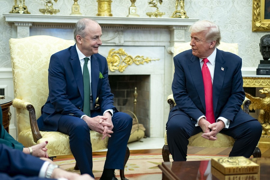 Κατά τη συνάντησή του με τον Ιρλανδό πρωθυπουργό Μιχόλ Μάρτιν με αφορμή την Ημέρα του Αγίου Πατρικίου, ο πρόεδρος των ΗΠΑ, Ντόναλντ Τραμπ σταμάτησε την πρότασή του στη μέση για να σχολιάσει τη στιλιστική επιλογή του Βανς για την συγκεκριμένη ημέρα.