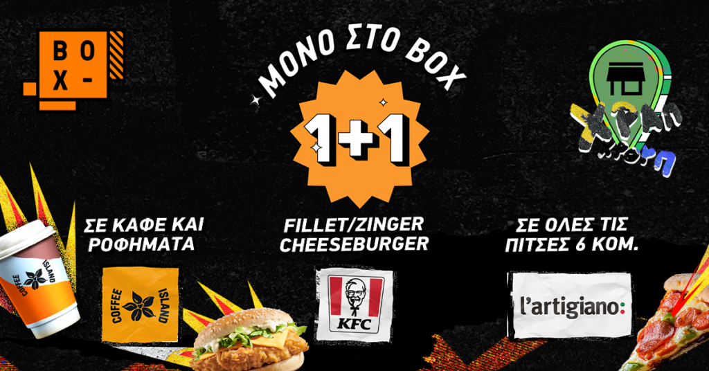 Αποκλειστική προσφορά 1+1 σε KFC, l’artigiano και Coffee Island φέρνει στους πελάτες του το ΒΟΧ Delivery App, για να μπορούν να απολαμβάνουν «διπλά» τα αγαπημένα τους φαγητά και ροφήματα.