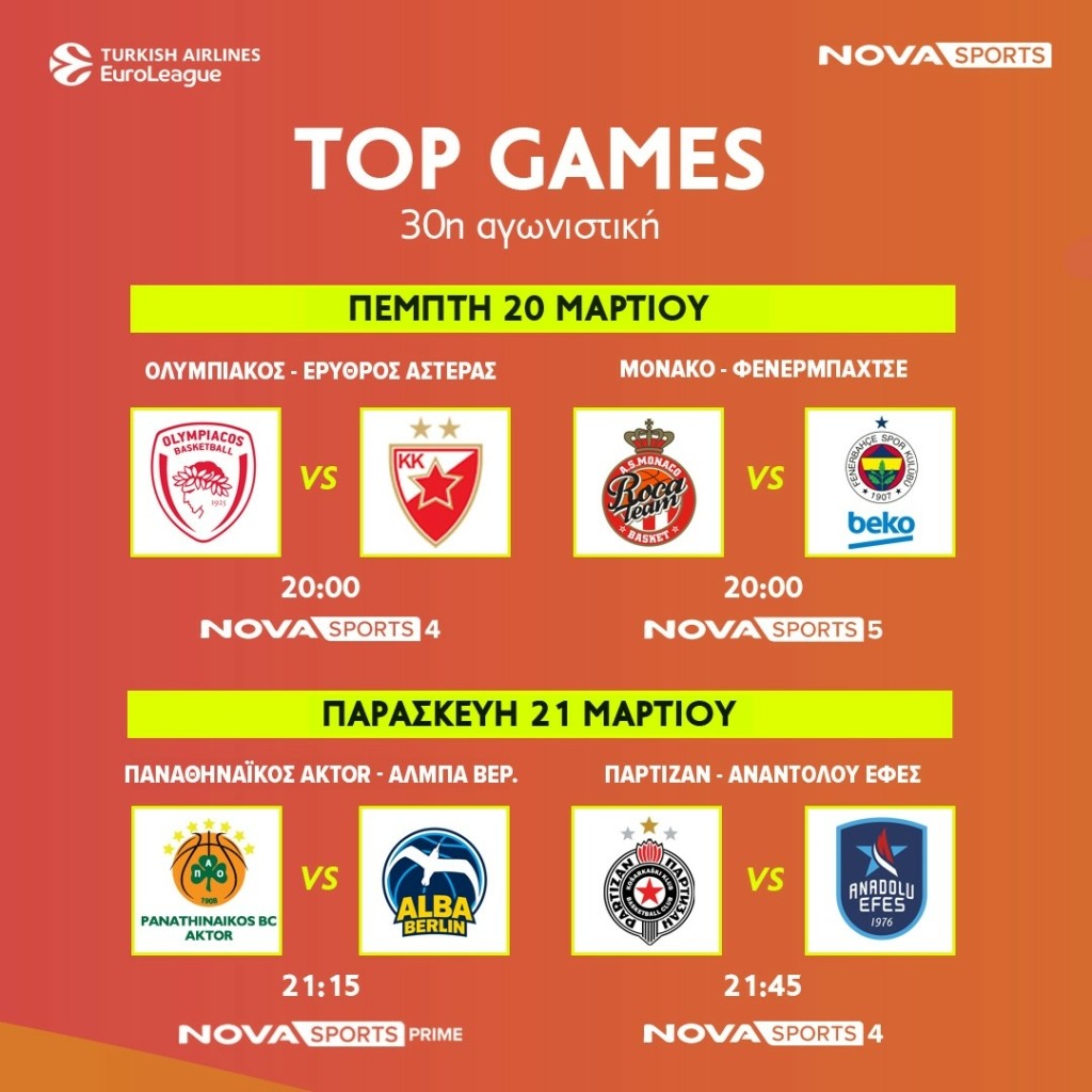 Η EuroLeague η κορυφαία ευρωπαϊκή διασυλλογική διοργάνωση στο χώρο του μπάσκετ, συνεχίζεται με αμείωτο ένταση και οι συνδρομητές της Nova ετοιμάζονται να απολαύσουν τις αναμετρήσεις της 30ης αγωνιστικής Ολυμπιακός – Ερυθρός Αστέρας (20/3, 20:00) και Παναθηναϊκός AKTOR – Άλμπα Βερολίνου (21/3, 21:15) στο παρκέ του Novasports.