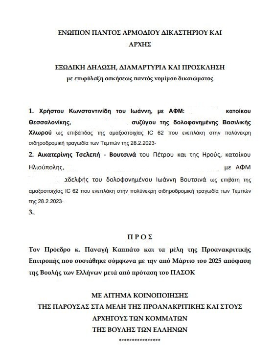 Εξώδικο στον Παναγή Καππάτο, πρόεδρο της προανακριτικής επιτροπής της Βουλής που συστάθηκε για να διερευνήσει τυχόν ποινικές ευθύνες του Χρήστο Τριαντόπουλου για το μπάζωμα στα Τέμπη, απέστειλαν δύο συγγενείς θυμάτων στο σιδηροδρομικό έγκλημα.