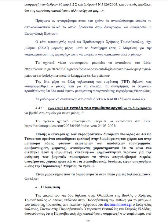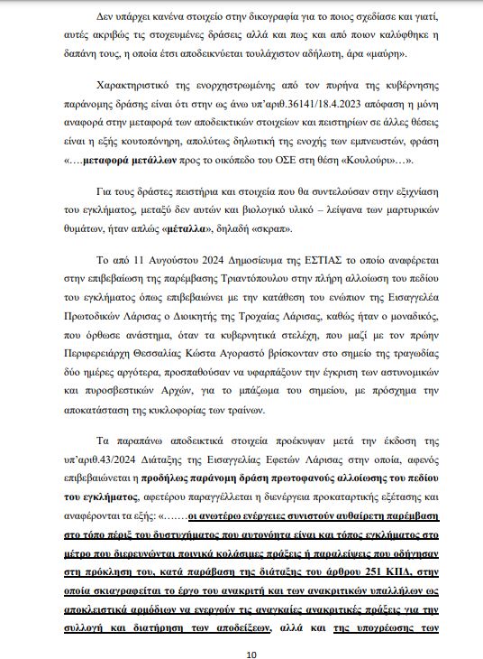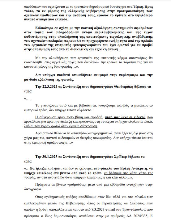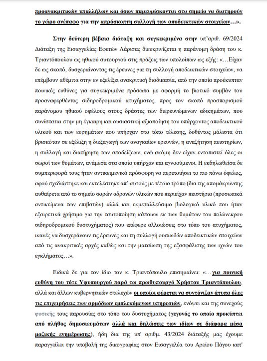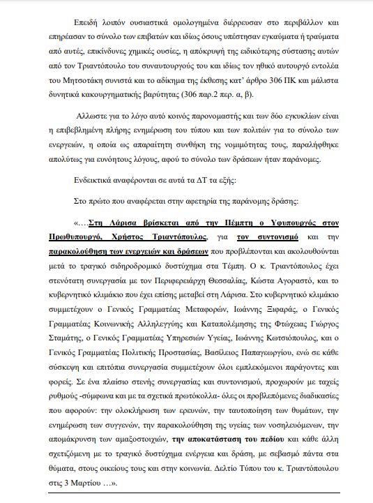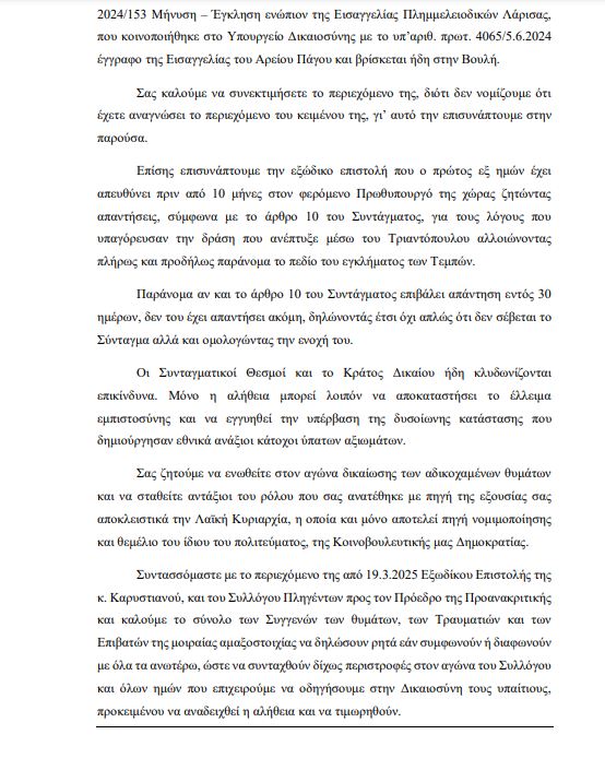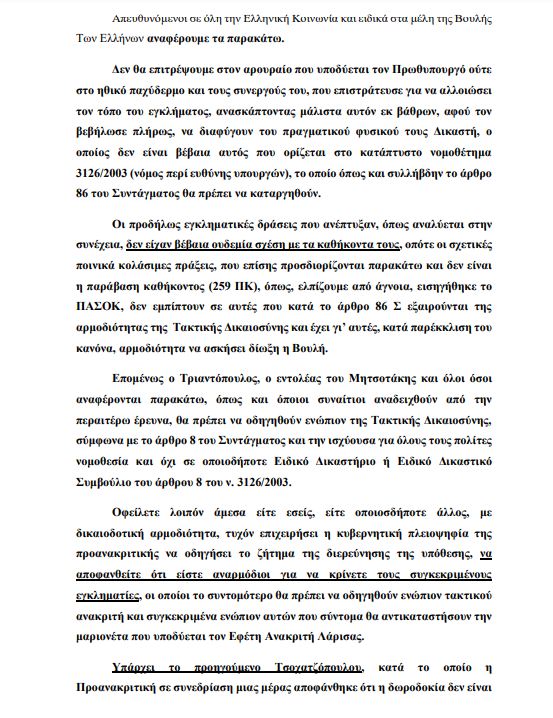 Επισημαίνουν δε στον κ. Καππάτο και τα μέλη της προανακριτικής τα εξής: «Οφείλετε λοιπόν άμεσα είτε εσείς, είτε οποιοσδήποτε άλλος, με δικαιοδοτική αρμοδιότητα, τυχόν επιχειρήσει η κυβερνητική πλειοψηφία της προανακριτικής να οδηγήσει το ζήτημα της διερεύνησης της υπόθεσης, να αποφανθείτε ότι είστε αναρμόδιοι για να κρίνετε τους συγκεκριμένους εγκληματίες, οι οποίοι το συντομότερο θα πρέπει να οδηγηθούν ενώπιον τακτικού ανακριτή και συγκεκριμένα ενώπιον αυτών που σύντομα θα αντικαταστήσουν την μαριονέτα που υποδύεται τον Εφέτη Ανακριτή Λάρισας.