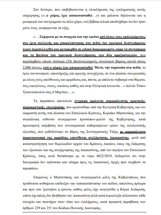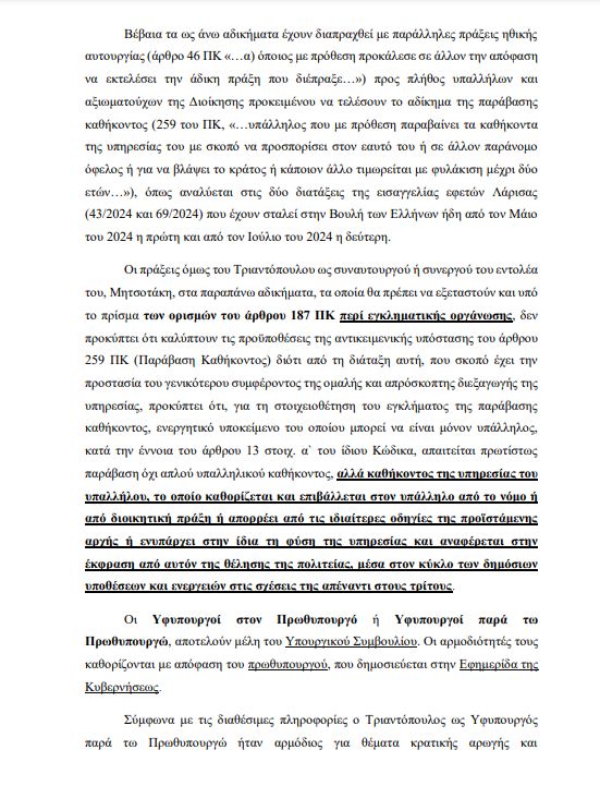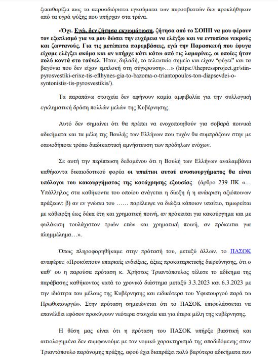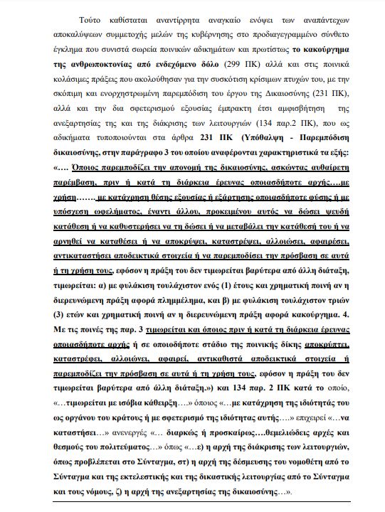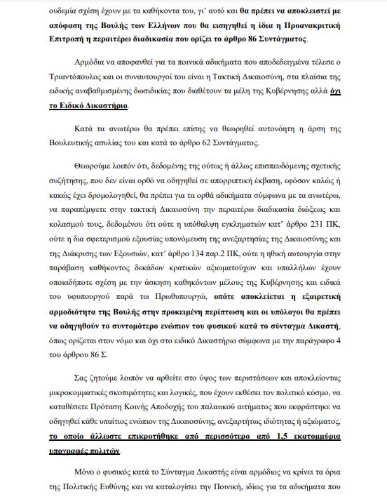 Με βάση αυτό το σκεπτικό αναπτύσσουν την άποψη ότι «ο Τριαντόπουλος, ο εντολέας του Μητσοτάκης και όλοι όσοι αναφέρονται παρακάτω, όπως και όποιοι συναίτιοι αναδειχθούν από την περαιτέρω έρευνα, θα πρέπει να οδηγηθούν ενώπιον της Τακτικής Δικαιοσύνης, σύμφωνα με το άρθρο 8 του Συντάγματος και την ισχύουσα για όλους τους πολίτες νομοθεσία και όχι σε οποιοδήποτε Ειδικό Δικαστήριο ή Ειδικό Δικαστικό Συμβούλιο του άρθρου 8 του ν. 3126/2003».