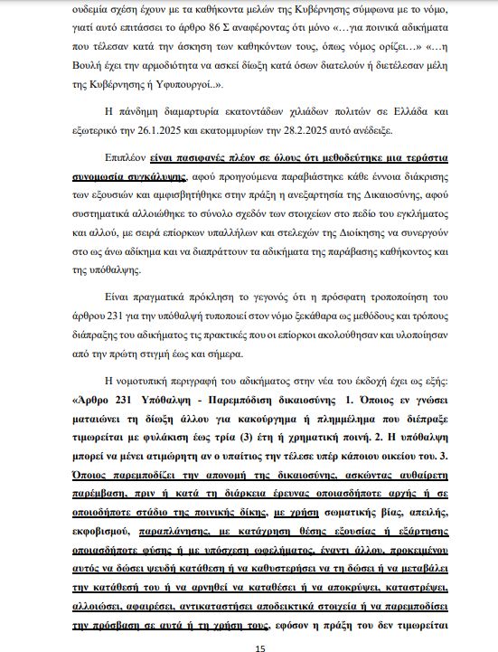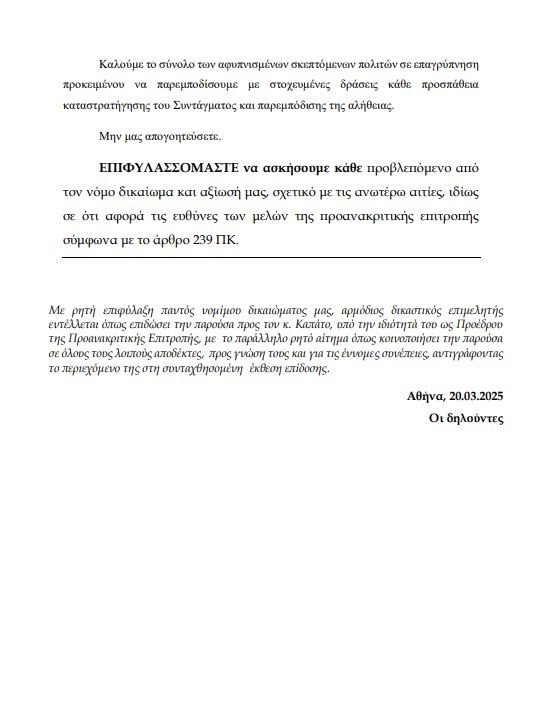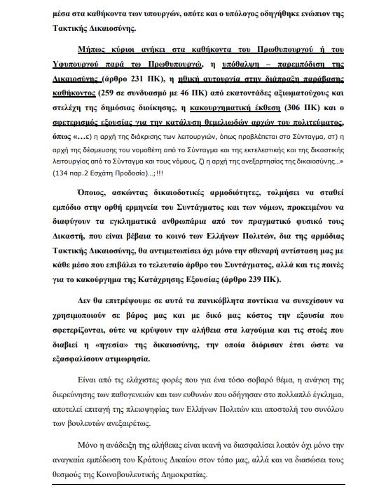 Αφού αναφέρουν μία σειρά από γεγονότα διαμηνύουν προς τον κ. Καππάτο: «ΕΠΙΦΥΛΑΣΣΟΜΑΣΤΕ να ασκήσουμε κάθε προβλεπόμενο από τον νόμο δικαίωμα και αξίωσή μας, σχετικό με τις ανωτέρω αιτίες, ιδίως σε ότι αφορά τις ευθύνες των μελών της προανακριτικής επιτροπής σύμφωνα με το άρθρο 239 ΠΚ».