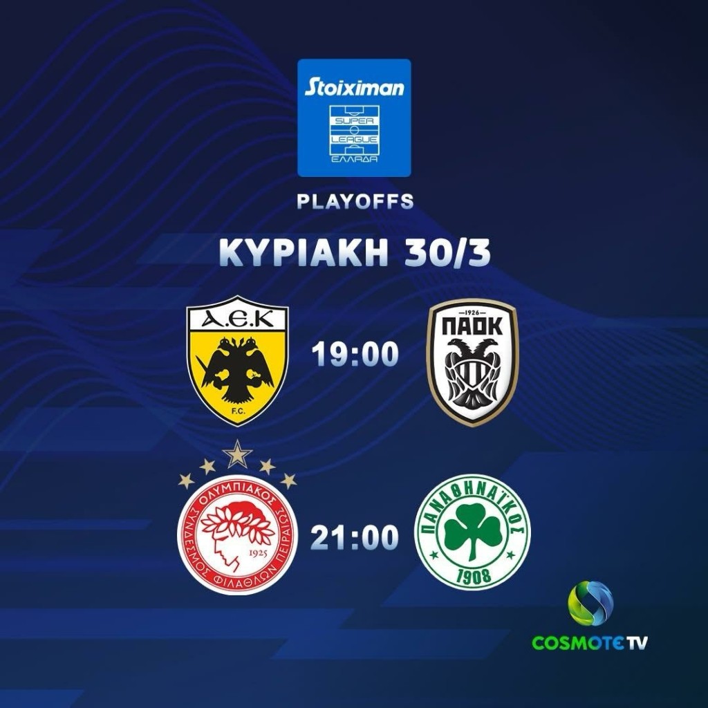 Τα Playoffs της Stoiximan Super League κάνουν «σέντρα» στην COSMOTE TV, με τον Ολυμπιακό, την ΑΕΚ, τον Παναθηναϊκό και τον ΠΑΟΚ να μπαίνουν στην τελική ευθεία για τη μάχη του τίτλου. Η 1η αγωνιστική θα διεξαχθεί την Κυριακή 30/3, με τα κανάλια COSMOTE SPORT να μεταδίδουν ζωντανά το «ντέρμπι των δικεφάλων», ΑΕΚ-ΠΑΟΚ (19.00, COSMOTE SPORT 2HD), και το «ντέρμπι των αιωνίων», Ολυμπιακός-Παναθηναϊκός (21.00, COSMOTE SPORT 1HD). Την Τετάρτη 2/4 θα λάβει χώρα και η 2η αγωνιστική της ημιτελικής φάσης του Κυπέλλου Ελλάδας Betsson. Η ΑΕΚ θα παίξει στην «OPAP Arena» με τον Ολυμπιακό (20.30, COSMOTE SPORT 1HD), μετά την ήττα της με 6-0 στον πρώτο αγώνα, ενώ ο ΟΦΗ θα υποδεχθεί τον Asteras Aktor (17.00, COSMOTE SPORT 2HD), έχοντας το προβάδισμα με 1-0.