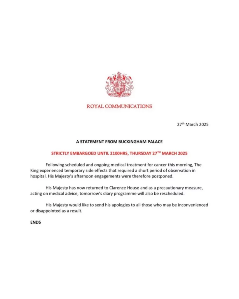 Υπενθυμίζεται ότι το Μπάκιγχαμ ανακοίνωσε πως ο 76χρονος μονάρχης υποβλήθηκε την Πέμπτη 27 Μαρτίου σε «προγραμματισμένη και συνεχιζόμενη ιατρική θεραπεία για τον καρκίνο», μετά την οποία παρουσίασε παρενέργειες που απαίτησαν «βραχεία περίοδο παρακολούθησης» στο νοσοκομείο.