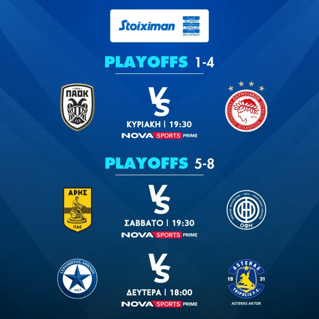 Στη Stoiximan Super League θα διεξαχθούν οι αναμετρήσεις της 2ης αγωνιστικής στα Playoffs για τις θέσεις 1-4 & 5-8 καθώς και στα Playouts για τις θέσεις 9-14. Στα κανάλια Novasports θα μεταδοθούν το ντέρμπι της Τούμπας ΠΑΟΚ – Ολυμπιακός (6/4, 19:30) για τα Playoffs και τις θέσεις 1-4, καθώς και οι αγώνες Άρης – ΟΦΗ (5/4, 19:30) & Aτρόμητος – Αsteras Aktor (7/4, 18:00) για τα Playoffs και τις θέσεις 5-8 και Λεβαδειακός – Πανσερραϊκός (5/4, 17:00) για τα Playouts και τις θέσεις 9-14. Στα κανάλια Cosmote Sport θα προβληθεί το ντέρμπι Παναθηναϊκός – ΑΕΚ (6/4, 21:30) για τα Playoffs και τις θέσεις 1-4, καθώς και ΠΑΣ Λαμία-Athens Kallithea FC (5/4, 20:00), Βόλος ΝΠΣ-Παναιτωλικός (6/4, 17:00) για τα Playouts και τις θέσεις 9-14. Οι αγώνες του ελληνικού πρωταθλήματος θα πλαισιωθούν στο Novasports και με την αγαπημένη εκπομπή των φιλάθλων «Η Ώρα των Πρωταθλητών» με τους Γιαννίκο Δούσκα, Λίλα Κουντουριώτη, Χριστίνα Κομίνη αλλά και με τον «Monday Football Club» με τους Ντέμη Νικολαϊδη και Γιάννη Πάγκο.
