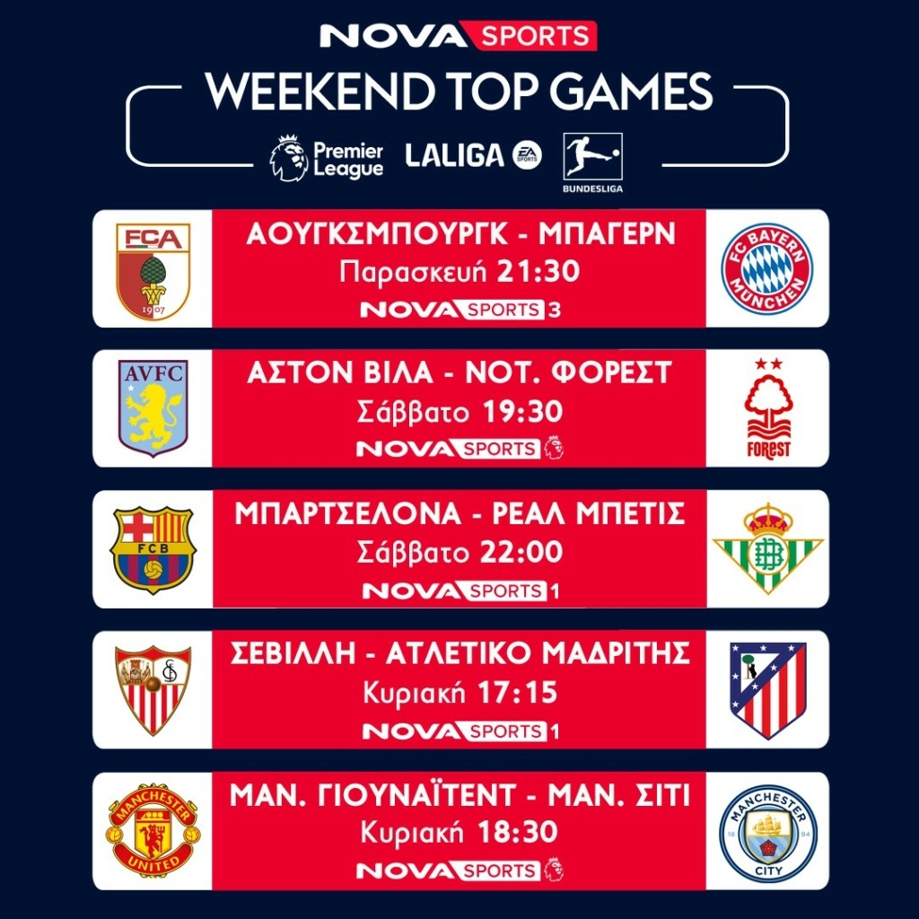Η Premier League, το κορυφαίο πρωτάθλημα στον κόσμο και με τη φωνή του Χρήστου Σωτηρακόπουλου επιστρέφει δυναμικά στην δράση με διπλή αγωνιστική και συναρπαστικά ντέρμπι όλα στο γήπεδο των καναλιών Novasports. Αρχικά οι συνδρομητές θα απολαύσουν για την 30η εμβόλιμη αγωνιστική Άρσεναλ-Φούλαμ (1/4, 21:45), Νότιγχαμ Φόρεστ-Μάντσεστερ Γιουνάιτεντ (1/4, 22:00) και στη συνέχεια στις 2/4 Matchday Live και Λεπτό προς λεπτό όπου δεσπόζουν οι αγώνες Λίβερπουλ – Έβερτον (22:00) και Μάντσεστερ Σίτι – Λέστερ (21:45). Το πλούσιο θέαμα της Premier League συνεχίζεται με την 31η αγωνιστική και τις αναμετρήσεις Έβερτον – Άρσεναλ (5/4, 14:30), Άστον Βίλα – Νότιγχαμ Φόρεστ (5/4, 19:30), Φούλαμ – Λίβερπουλ (6/4, 16:00) και Μάντσεστερ Γιουνάιτεντ – Μάντσεστερ Σίτι (6/4, 18:30).