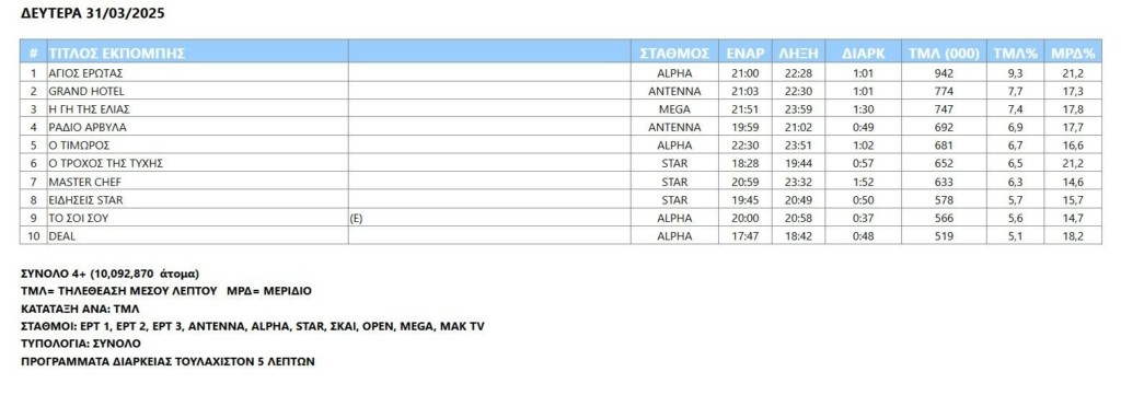 Το ενδιαφέρον στοιχείο της ημέρας δεν είναι το πρόγραμμα που πλασαρίστηκε πρώτο ή δεύτερο στον πίνακα της Nielsen με τα δημοφιλέστερα της ημέρας -της τελευταίας του Μαρτίου- αλλά η επανάκαμψη στο βάθρο της σειράς «Η γη της ελιάς», έστω και στην τρίτη θέση, όμως με τηλεθέαση κοντά σε εκείνες του παλιού καλού καιρού της.