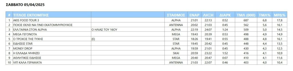 Η σειρά ταξιδιωτικών- γευστικών ντοκιμαντέρ «Akis Food Tour 3»- που κάνει διεθνή καριέρα μέσω Netflix έκανε την έκπληξη το Σάββατο κατακτώντας την κορυφαία θέση τηλεθέασης της ημέρας, σύμφωνα με τις δυναμομετρήσεις της Nielsen. Την Κυριακή, τα «σκήπτρα» τηλεθέασης πήρε η «Γη της ελιάς».
