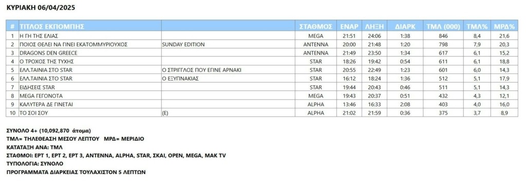 Στο τηλεβαρόμετρο της Κυριακής αυτή που ξεχωρίζει είναι η διάκριση της πρεμιέρας «Gragons Den Greece» στην τρίτη θέση αλλά και το πλασάρισμα της μεσημεριανής ψυχαγωγικοενημερωτικής εκπομπής «Καλύτερα δεν γίνεται» στην ένατη, μεν, πρώτη δε της κατηγορίας της.