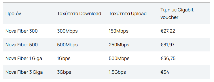 Με τις τιμές να ξεκινούν από τα €27,22/ μήνα με κουπόνι Gigabit Voucher, η Nova προσφέρει τις εξής επιλογές για σύνδεση οπτικών ινών*: