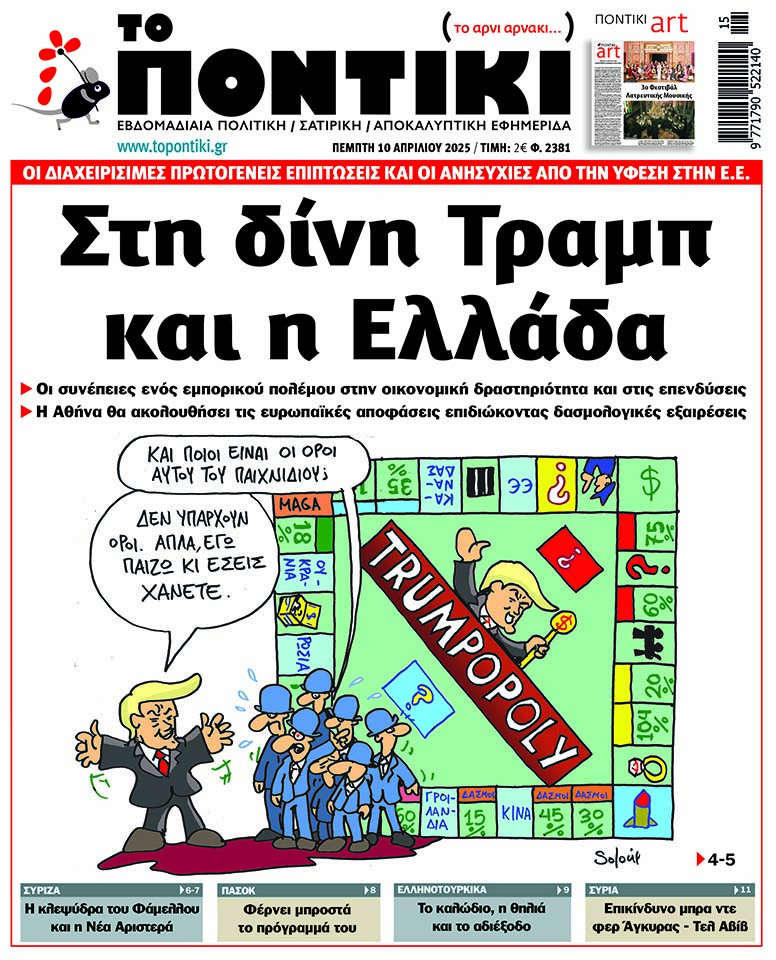Με πρωτοσέλιδο τίτλο «Στη δίνη Τραμπ και η Ελλάδα» και αναλυτικό – αποκαλυπτικό ρεπορτάζ για τις συνέπειες ενός εμπορικού πολέμου στην οικονομική δραστηριότητα και στις επενδύσεις, αλλά και για το αν η Αθήνα θα ακολουθήσει τις ευρωπαϊκές αποφάσεις επιδιώκοντας δασμολογικές εξαιρέσεις, κυκλοφορεί το «ΠΟΝΤΙΚΙ» το πρωί της Πέμπτης.