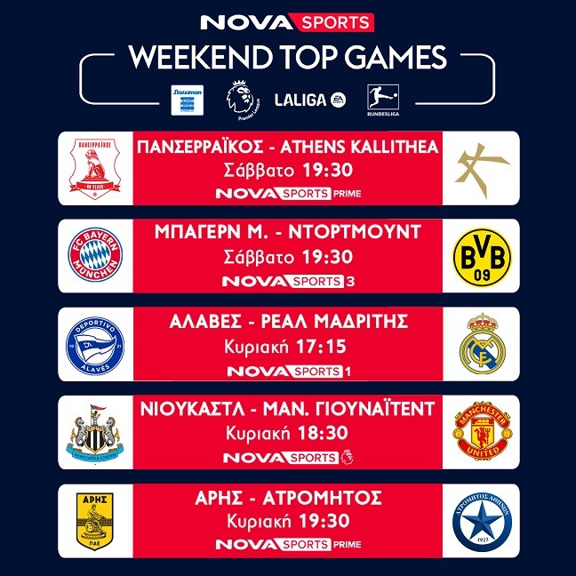 Η Premier League, το κορυφαίο πρωτάθλημα στον κόσμο και με τη φωνή του Χρήστου Σωτηρακόπουλου συνεχίζεται με αμείωτο ενδιαφέρον στο γήπεδο των καναλιών Novasports. Οι συνδρομητές θα απολαύσουν για την 32η αγωνιστική Μάντσεστερ Σίτι-Κρίσταλ Πάλας (12/4, 14:30), Νότιγχαμ Φόρεστ-Έβερτον (12/4, 17:00), Άρσεναλ-Μπρέντφορντ (12/4, 19:30), Λίβερπουλ – Γουέστ Χαμ (13/4, 16:00) και Νιουκάστλ-Μάντσεστερ Γιουνάιτεντ (13/4, 18:30).