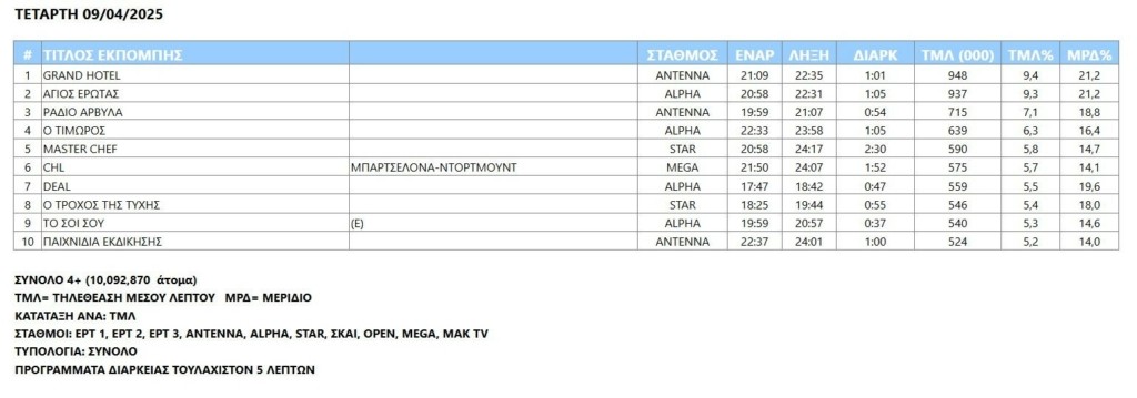 Ο «Τιμωρός» ήταν η τέταρτη επιλογή των τηλεθεατών με πέμπτο το «MasterChef», ενώ η «ζωντανή» μετάδοση του ποδοσφαιρικού ματς Μπαρτελόνα– Ντόρτμουντ για το εισιτήριο στα ημιτελικά του Champions League κατέλαβε την έκτη θέση στο Top 10 της ημέρας.