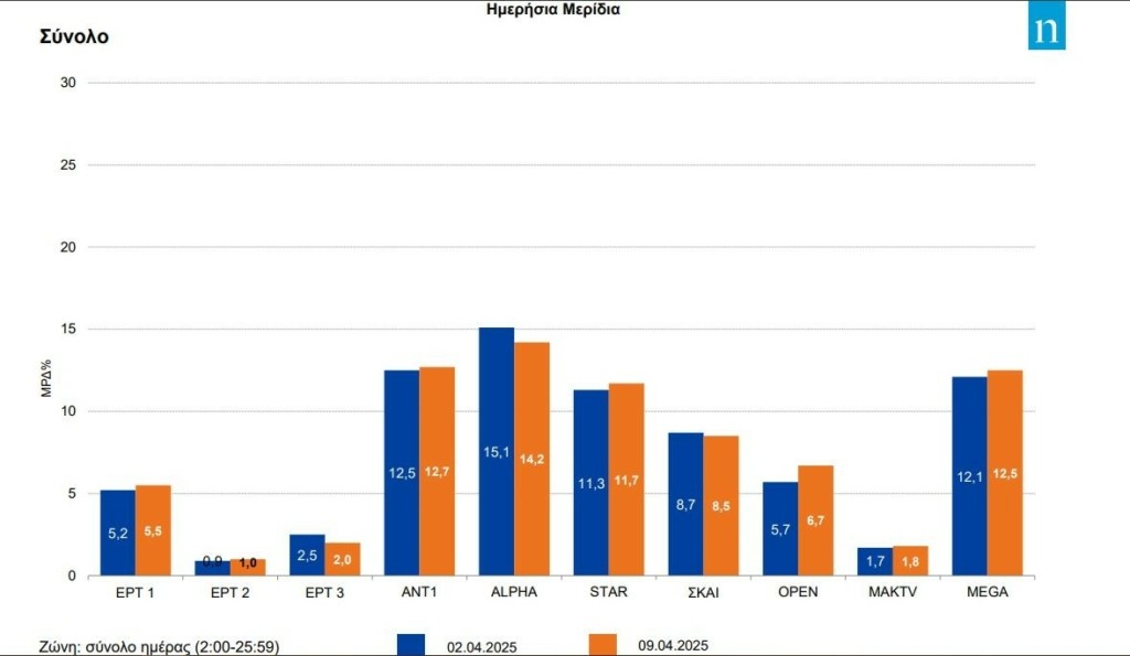 Κάτι ανάλογο συνέβη με ΣΚΑΪ και Open καθώς η επιστροφή στην προγραμματική κανονικότητα πρόσθεσε δύο ποσοστιαίες μονάδες στο μερίδιο του καναλιου του Φαλήρου και σχεδόν μιάμισης σε αυτό του σταθμού της Παιανίας, όπως αυτά είχαν διαμορφωθεί την ακριβώς προηγούμενη ημέρα.