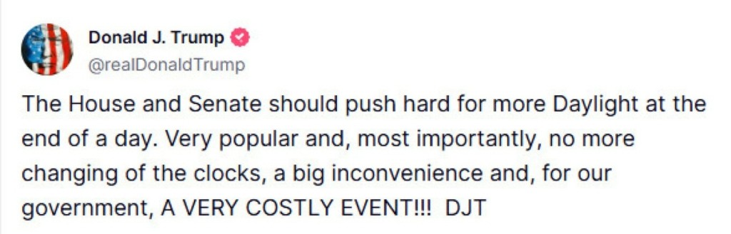 «Η Βουλή των Αντιπροσώπων και η Γερουσία πρέπει να ενεργοποιηθούν για να έχουμε περισσότερο ήλιο στο τέλος της ημέρας» ανέφερε στην ανάρτησή του στην πλατφόρμα Truth Social. Το μέτρο αυτό είναι «πολύ δημοφιλές», διαβεβαίωσε και, κάτι που είναι «ακόμη σημαντικότερο», σημαίνει ότι «δεν θα χρειαζόταν πια να αλλάζουμε την ώρα στα ρολόγια –μια μεγάλη φασαρία– και, για το κράτος, ένα δαπανηρό γεγονός!». Ο Ντόναλντ Τραμπ κάλεσε σήμερα το Κογκρέσο να νομοθετήσει για να καταργήσει την αλλαγή της ώρας στις ΗΠΑ και να υιοθετήσει σε μόνιμη βάση τη θερινή ώρα.
