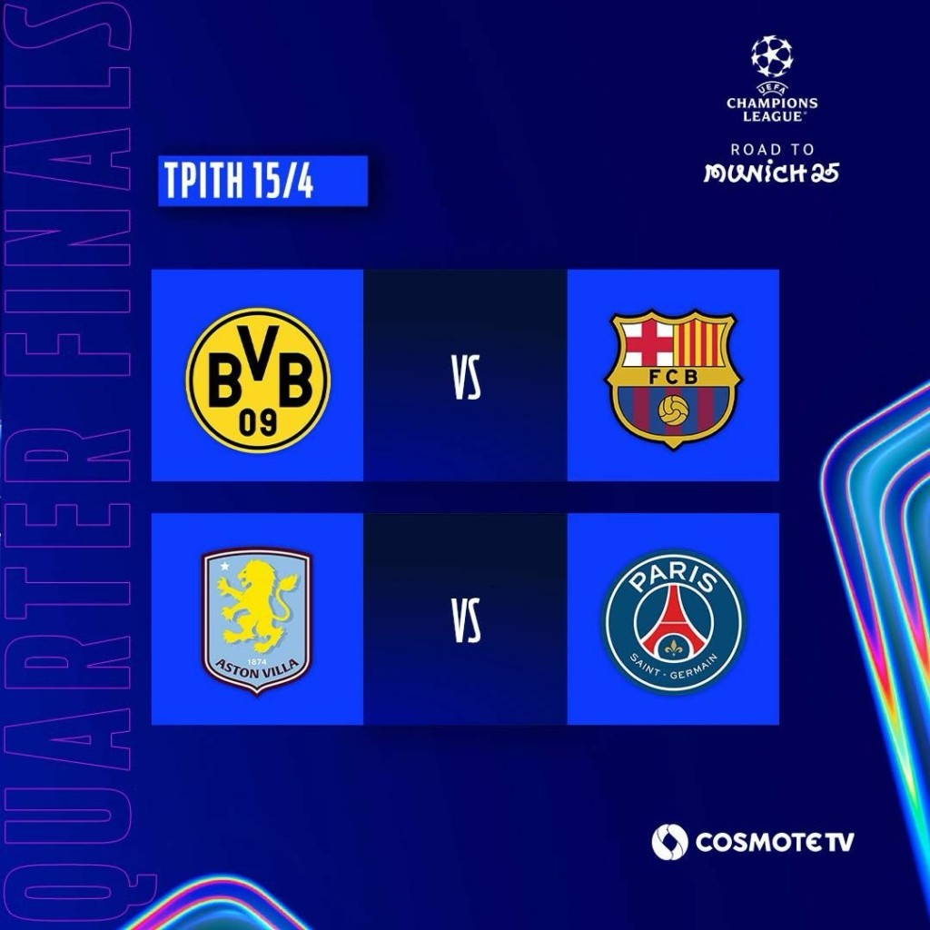 Την Τρίτη 15/4 η Ντόρτμουντ θα υποδεχθεί τη Μπαρτσελόνα (22.00, COSMOTE SPORT 2HD & COSMOTE SPORT 4Κ), προερχόμενη από την ήττα με 4-0 στο πρώτο ματς, ενώ η Άστον Βίλα θα επιχειρήσει να ανατρέψει στην έδρα της την ήττα με 3-1 από την Παρί Σεν Ζερμέν στο Παρίσι (22.00, COSMOTE SPORT 3HD). Την Τετάρτη 16/4 η Ίντερ του Λαουτάρο Μαρτίνες θα παίξει στο Μιλάνο με τη Μπάγερν Μονάχου του Χάρι Κέιν (22.00, COSMOTE SPORT 3HD), με στόχο να «προστατέψει» το υπέρ της 2-1 από τον πρώτο αγώνα.