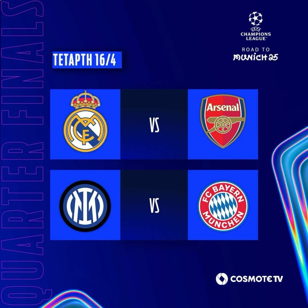Η 2η αγωνιστική της προημιτελικής φάσης του UEFA Champions League έρχεται το διήμερο 15-16/4, με την COSMOTE TV να φιλοξενεί και τους τέσσερις αγώνες που θα δώσουν τα εισιτήρια για τα ημιτελικά. Τα φώτα θα είναι «στραμμένα» στο «Σαντιάγο Μπερναμπέου», εκεί όπου η Ρεάλ Μαδρίτης θα υποδεχθεί την Άρσεναλ (16/4, 22.00, COSMOTE SPORT 2HD & COSMOTE SPORT 4Κ) με στόχο να κάνει τη μεγάλη ανατροπή και να γυρίσει το εις βάρος της 3-0 του πρώτου ματς. Η δημοσιογραφική ομάδα των καναλιών COSMOTE SPORT θα μεταφέρει όλες τις εξελίξεις του διημέρου, μέσα από πλούσιο ρεπορτάζ και ειδικές εκπομπές αφιερωμένες στην κορυφαία διασυλλογική διοργάνωση.