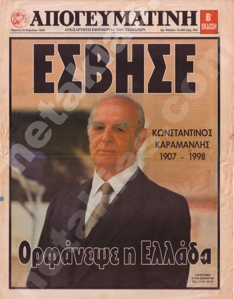 «Συμπληρώνονται σήμερα 27 χρόνια από το θάνατο του ιδρυτή της Νέας Δημοκρατίας Εθνάρχη Κωνσταντίνου Καραμανλή.