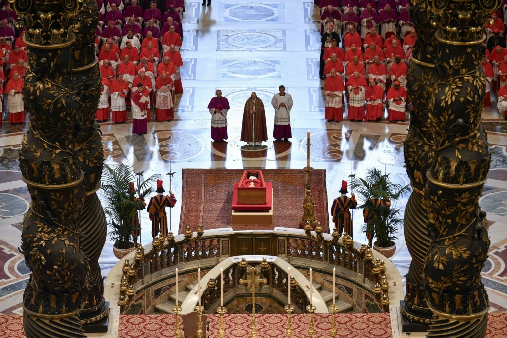 Καρδινάλιοι με κόκκινα άμφια, ιερείς και μέλη της Ελβετικής Φρουράς βάδιζαν αργά προς τη λουσμένη στο φως πλατεία, την ώρα που χορωδία έψαλλε ψαλμούς και προσευχές στα λατινικά, με τις μεγάλες καμπάνες της Βασιλικής να χτυπούν πένθιμα.