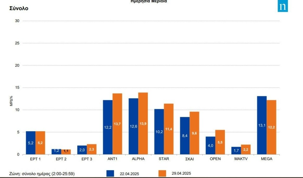 Με φόρα από προχθές ο Alpha εξακολούθησε και την Τρίτη να προηγείται στις προτιμήσεις των τηλεθεατών με τον ΑΝΤ1 στο κατόπι του να προσθέτει «πόντους» στο μερίδιο του στέλνοντας το Mega τρίτη θέση χωρίς όμως να επηρεάζει την κατάταξη του η ανεπαίσθητη μείωση του μεριδίου (0,3%) του από την μία ημέρα στην άλλη.