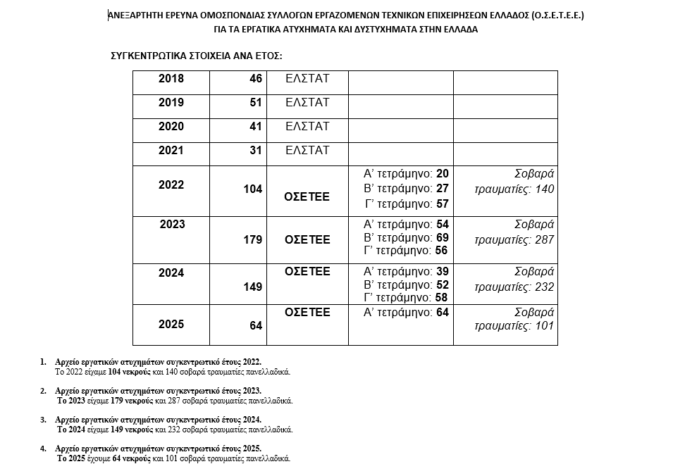 Συγκεκριμένα, σύμφωνα με τα στοιχεία της Ομοσπονδίας Συλλόγων Εργαζομένων Τεχνικών Επιχειρήσεων Ελλάδος (ΟΣΕΤΕΕ), μόνο το Α’ τετράμηνο του 2025 είχαμε 64 νεκρούς στους χώρους εργασίας, ενώ όπως τόνισε και ο πρόεδρος της Ομοσπονδίας κ. Ανδρέας Στοϊμενίδης «πάμε δυστυχώς για χρονιά ρεκόρ».