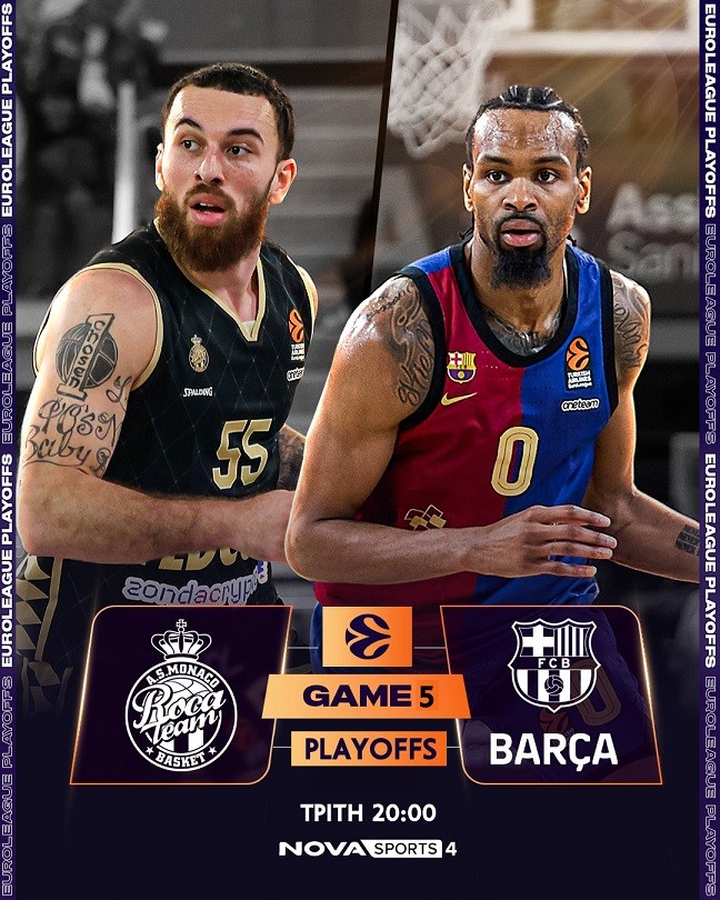 Παράλληλα, στις 20:00 θα μεταδοθεί (6/5) στο Novasports4 ο 5ος και τελευταίος αγώνας της σειράς Μονακό – Μπαρτσελόνα με τον νικητή να προκρίνεται και να αντιμετωπίζει στον άλλο ημιτελικό τον Ολυμπιακό.