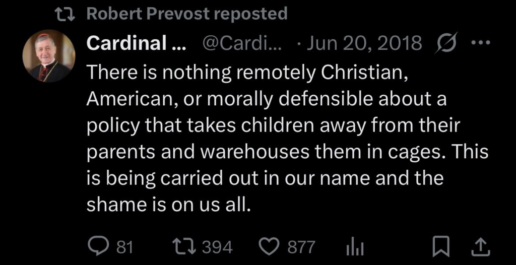 Πριν εκλεγεί Πάπας, κοινοποίησε αρκετές αναρτήσεις στο X που επέκριναν την προσέγγιση της κυβέρνησης Τραμπ στο θέμα της μετανάστευσης, συμπεριλαμβανομένης της αμφιλεγόμενης πολιτικής χωρισμού οικογενειών στα σύνορα των ΗΠΑ. Σε μια ανάρτηση που αναδημοσίευσε, ο αρχικός συντάκτης αναφέρει: «Δεν υπάρχει τίποτα το χριστιανικό, αμερικανικό ή ηθικά δικαιολογημένο σε μια πολιτική που απομακρύνει τα παιδιά από τους γονείς τους και τα αποθηκεύει σε κλουβιά. Αυτό γίνεται στο όνομά μας και η ντροπή είναι δική μας».