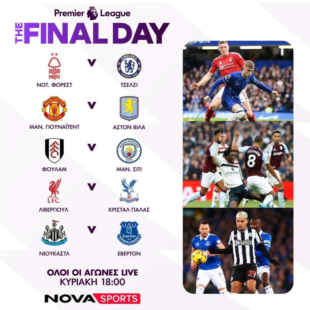 Η Premier League, το κορυφαίο πρωτάθλημα στον κόσμο και με τη φωνή του Χρήστου Σωτηρακόπουλου ολοκληρώνεται για τη φετινή σεζόν στο γήπεδο των καναλιών Novasports και οι συνδρομητές θα απολαύσουν την 38η αγωνιστική σε παράλληλη μετάδοση την Κυριακή 25/5 (18:00). Από το πρόγραμμα ξεχωρίζουν οι αναμετρήσεις Νότιγχαμ Φόρεστ-Τσέλσι για την έξοδο στο UEFA Champions League, Σαουθάμπτον-Άρσεναλ, Τότεναμ-Μπράιτον, Μάντσεστερ Γιουνάιτεντ.-Άστον Βίλα, Φούλαμ-Μάνστεστερ Σίτι, Λίβερπουλ-Κρίσταλ Πάλας. Οι αγώνες θα πλαισιωθούν και από τις εκπομπές «Premier League Kick» Off και «Premier League The Show» με τους Άγγελο Στυλιάδη και Γιώργο Σαμαρά.