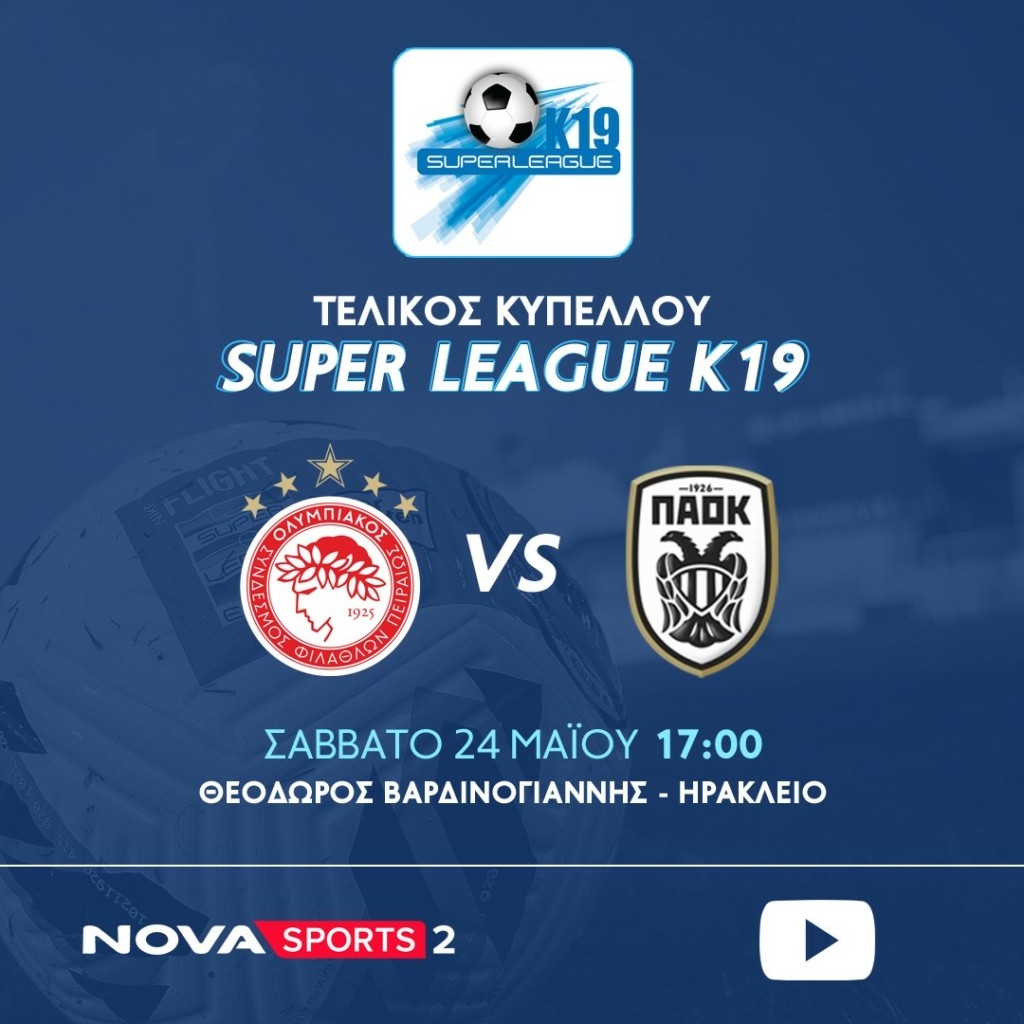 Παράλληλα, το Σάββατο 24/5 θα διεξαχθεί ο Τελικός Αγώνας του “Κυπέλλου Super League K19” ανάμεσα στον Ολυμπιακό και τον ΠΑΟΚ. H αναμέτρηση θα γίνει στο γήπεδο “Θεόδωρος Βαρδινογιάννης”, στο Ηράκλειο Κρήτης, θα ξεκινήσει στις 17:00 και θα μεταδοθεί τηλεοπτικά από το Novasports2 αλλά και από το YouTube του novasports.gr.