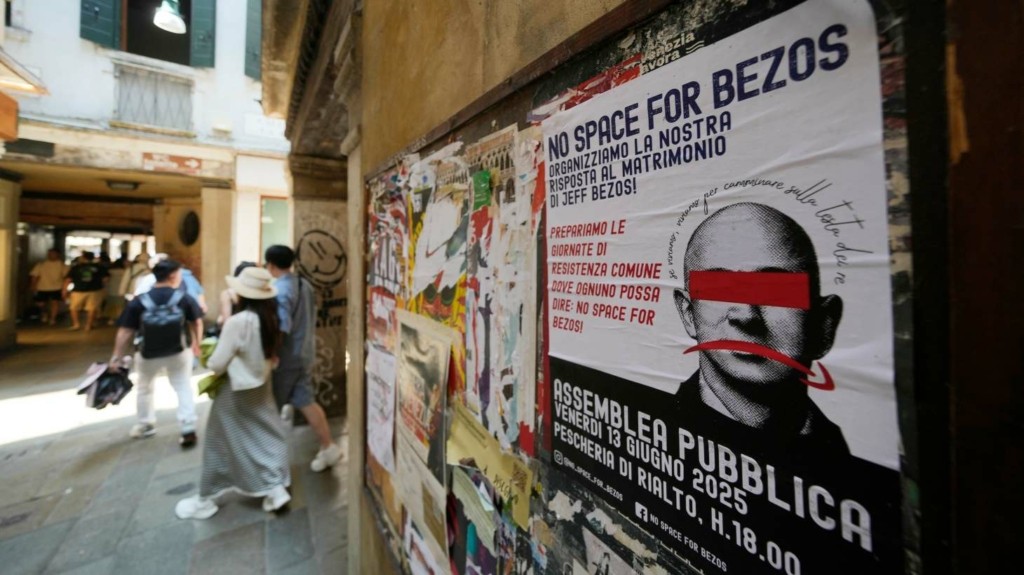 Εδώ και ημέρες, μέλη του κινήματος “No Space for Bezos” προσπαθούν να χαλάσουν το πάρτι αναρτώντας πανό κατά του Μπέζος στην εμβληματική Γέφυρα του Ριάλτο και απλώνοντας έναν τεράστιο καμβά στην κεντρική πλατεία του Αγίου Μάρκου ζητώντας από τον μεγιστάνα της τεχνολογίας να πληρώσει περισσότερους φόρους.