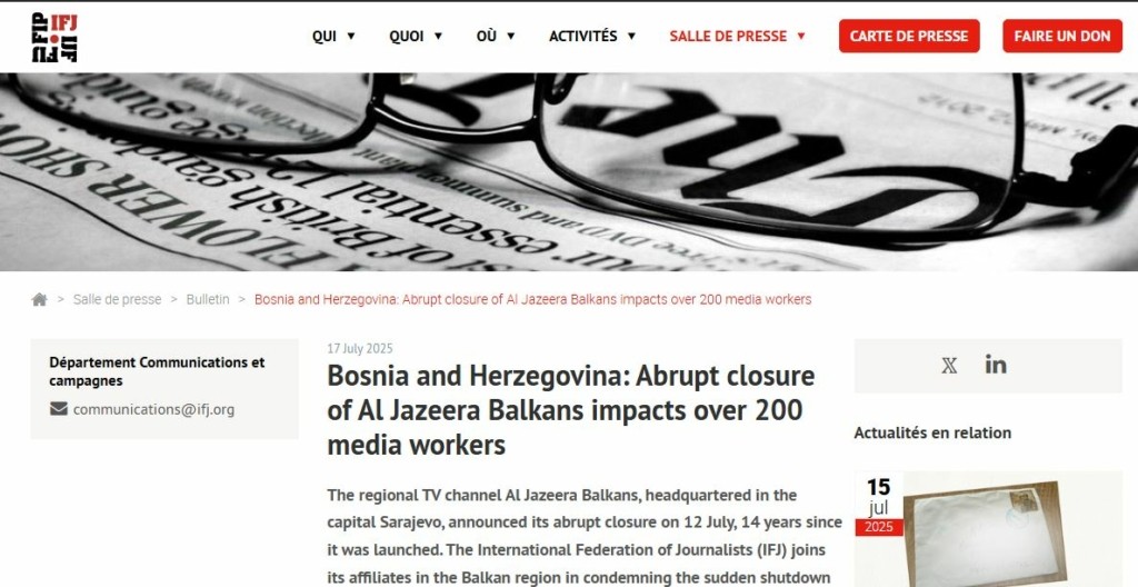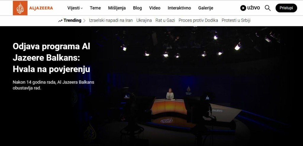 Το παράρτημα του αραβικού διεθνούς ειδησεογραφικού δικτύου, Al Jazeera Balkans με έδρα το Σεράγιεβο, έχει ήδη αναστείλει την κανονική μετάδοση περιεχομένου του και μέχρι το τέλος του μήνα, οπότε και θα κλείσει οριστικώς, θα μεταδίδει πρόγραμμα κονσέρβα.