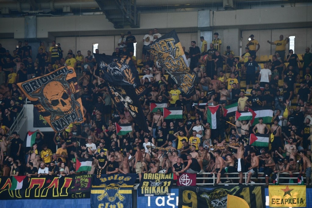 Οι φίλοι της ΑΕΚ θέλησαν με αυτόν τον τρόπο να εκφράσουν τη στήριξή τους στον παλαιστινιακό λαό, με την αστυνομία, θυμίζουμε, να προχωρά νωρίτερα σε προσαγωγές έξω από το γήπεδο ορισμένων «κιτρινόμαυρων» οπαδών.