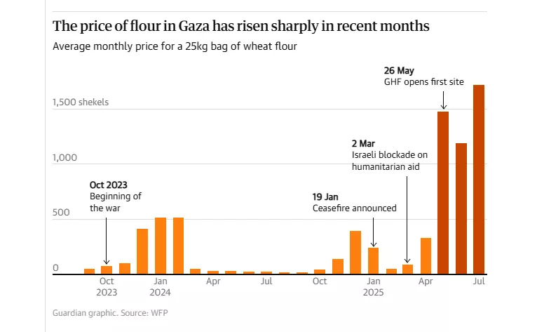 Μέχρι τις 22 Ιουλίου, το GHF λειτουργούσε επί 58 ημέρες, αλλά τα τρόφιμα που παρείχε θα μπορούσαν να συντηρήσουν τον πληθυσμό της Γάζας μόνο για λιγότερο από ένα δεκαπενθήμερο, ακόμη και αν είχαν διανεμηθεί ισόποσα.