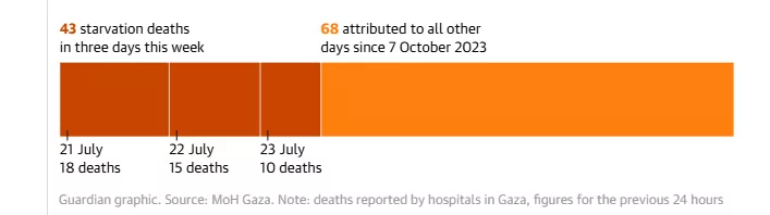 Την ίδια στιγμή, η κατάσταση στον θύλακα μόνο χειροτερεύει. Για μήνες το Ισραήλ διατηρούσε τις αποστολές τροφίμων στη Γάζα πολύ κάτω από τις μερίδες πείνας. Τώρα ο αριθμός των νεκρών αυξάνεται ραγδαία, σημειώνει και ο Guardian για τον λιμό.